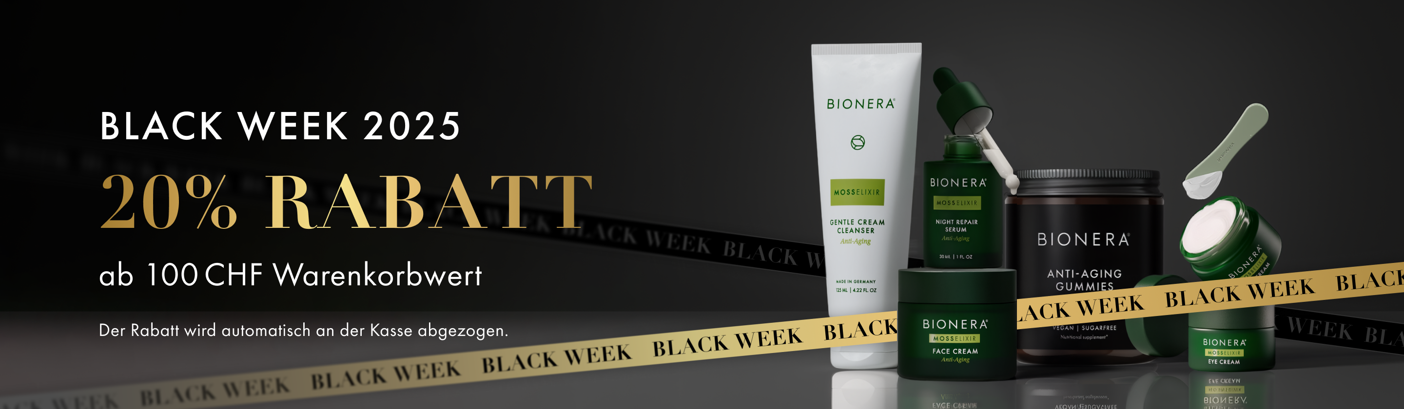 Hinweis: Der 20 %-Rabatt gilt ab einem Warenkorbwert von 100 CHF. Der Rabatt wird automatisch im Checkout abgezogen. Produkt-Sets sind von der Black Week Aktion ausgeschlossen, da sie bereits einen Preisvorteil haben.